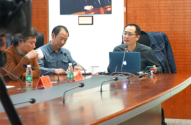 (左一:本屆雙年展中國館策展人邱志杰、左二:文化部外聯局局長助理鄭浩、右二:中國美術家協會《美術》雜志社社長兼主編尚輝)