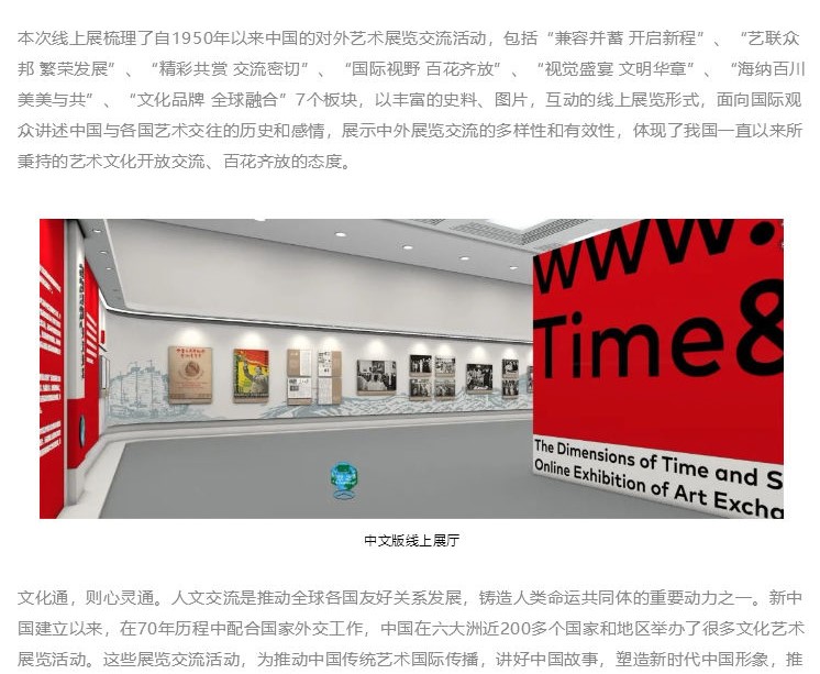 近日,“時空之維—中國與世界的藝術交往”線上展成功發布。展覽由中國對外文化集團有限公司主辦,中國對外藝術展覽有限公司承辦,以中、英、法、阿、意、西六種語言呈現。