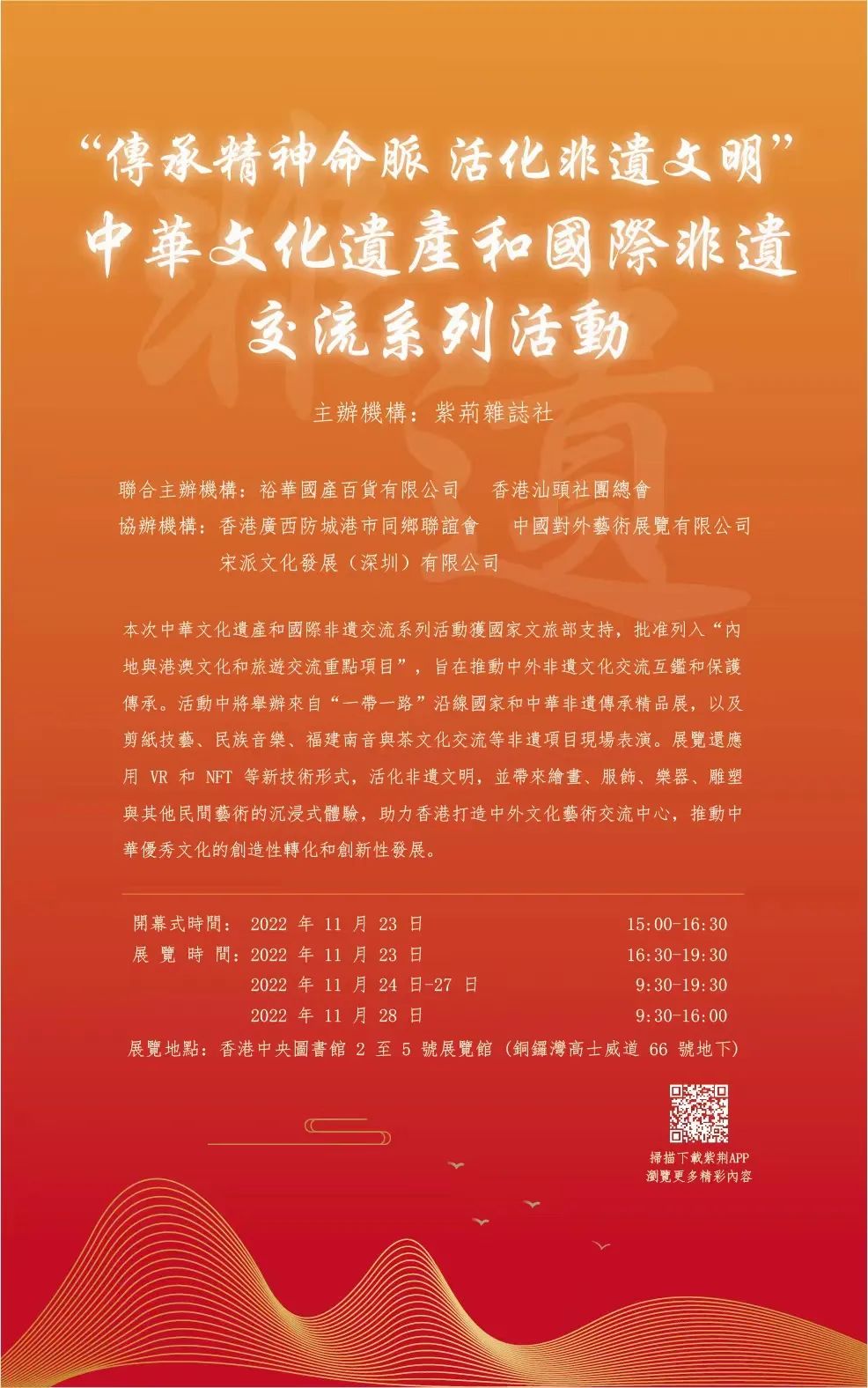 11月23日,由紫荊雜志社主辦,裕華國產(chǎn)百貨有限公司、香港汕頭社團(tuán)總會(huì)聯(lián)合主辦,香港廣西防城港市同鄉(xiāng)聯(lián)誼會(huì)、中國對(duì)外藝術(shù)展覽有限公司、宋派文化發(fā)展(深圳)有限公司協(xié)辦的“傳承精神命脈活化非遺文明”中華文化遺產(chǎn)和國際非遺交流系列活動(dòng)在香港中央圖書館舉行開幕式。本次活動(dòng)獲國家文旅部指導(dǎo),批準(zhǔn)列入“內(nèi)地與港澳文化和旅游交流重點(diǎn)項(xiàng)目”,得到香港中聯(lián)辦宣文部、香港特區(qū)政府文化體育及旅游局、香港特區(qū)政府民政及青年事務(wù)局、廣東省文化和旅游廳的支持,旨在推動(dòng)中外非遺文化交流互鑒和保護(hù)傳承。