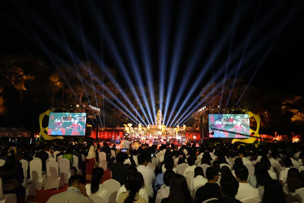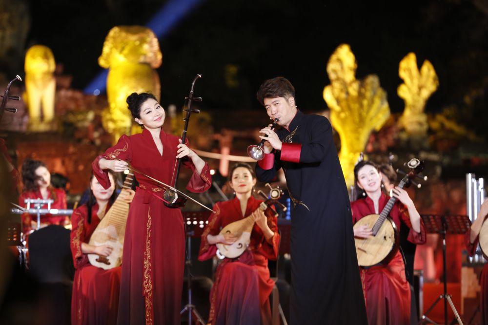 來自中央民族樂團、中國歌劇舞劇院、中國國家話劇院的藝術家與柬埔寨文化藝術部舞蹈團、樂團的藝術家,以及柬埔寨兒童合唱團聯袂帶來了精彩的演出。柬埔寨諾羅敦·珍娜小公主深情演唱象征中柬友誼的歌曲《懷念中國》;中柬樂團合奏民樂節目《祝賀》,用音樂獻上對彼此最真摯的祝福;中國“樂器之王”琵琶與柬埔寨古老樂器長臂琴共同演奏《玫瑰印象》,兩國最具代表的音色在共鳴中奏出和美之音;最后,中柬兩國藝術家合作兩國代表性歌曲《茉莉花》《高棉的靈魂》,將演出推向高潮。