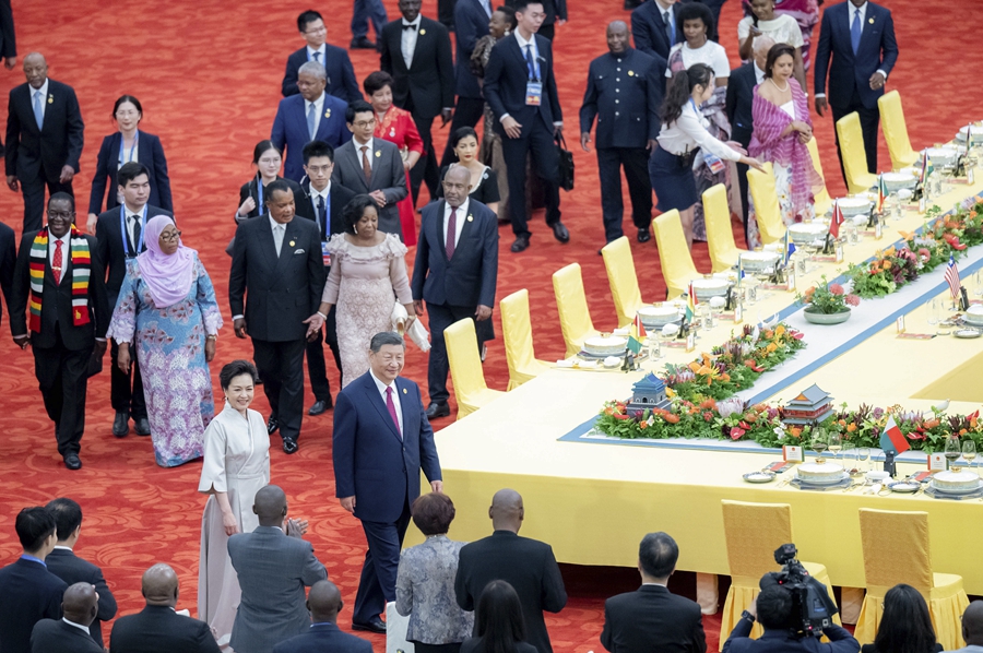 9月4日晚,國(guó)家主席習(xí)近平和夫人彭麗媛在北京人民大會(huì)堂舉行宴會(huì),歡迎來華出席中非合作論壇北京峰會(huì)的非方及國(guó)際貴賓。這是習(xí)近平和彭麗媛同貴賓們共同步入宴會(huì)廳。新華社記者劉彬攝