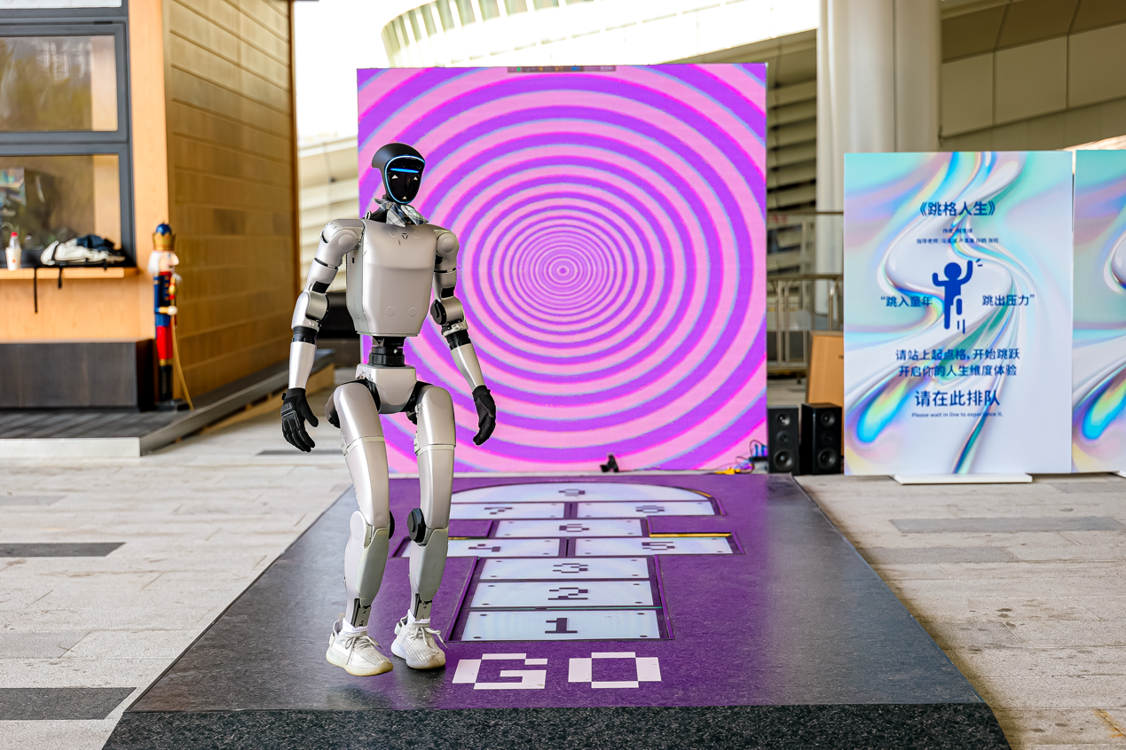另一件備受關(guān)注的新質(zhì)影像代表作品是由香港數(shù)字藝術(shù)家周也山創(chuàng)作的裝置作品《灣區(qū)之眼》。作品以“天圓地方的當(dāng)代凝視”為核心概念,結(jié)合裸眼3D與AI光影技術(shù),在投影中交織傳統(tǒng)紋樣與灣區(qū)數(shù)字肌理。通過動態(tài)光影的變化,以“方靜圓動”詮釋文化根基與創(chuàng)新精神的融合。深圳青年藝術(shù)家何思琦的互動作品《跳格人生》以“跳房子”為靈感,引導(dǎo)觀眾通過身體參與喚醒記憶與情感,讓藝術(shù)真正走進(jìn)城市生活。